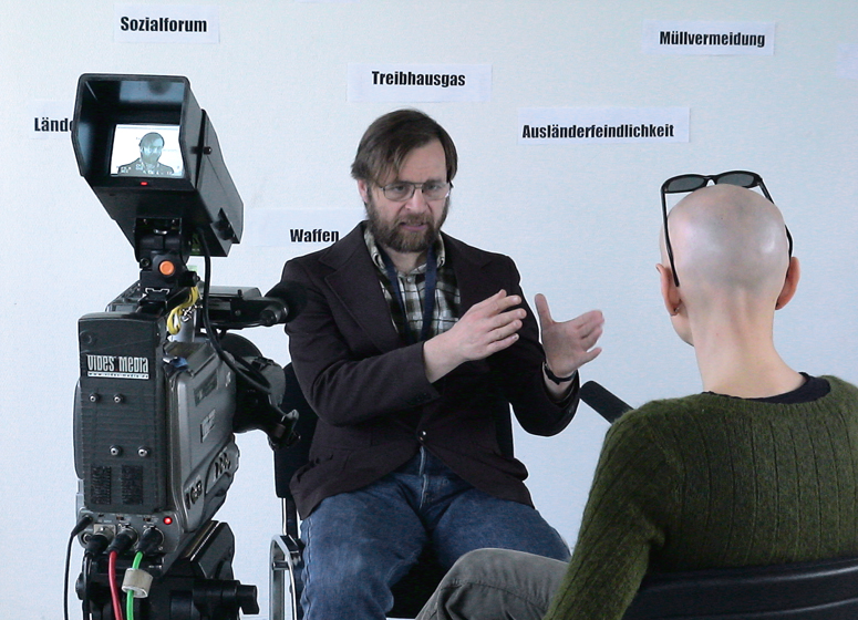 G-8-Gipfel und Gegengipfel stellen eine interessante Situation in Rostock und Heiligendamm her: Gruppen, die sich sonst nicht begegnen, treffen unausweichlich aufeinander. Auch „Art Goes Heiligendamm“ bringt Menschen nach Rostock – die international agierenden Künstler. Auf diese einmalige Situation des Zusammentreffens gehe ich ein in dem Video „Soziale Geräusche G8 Heiligendamm“. Ich interviewte im Vorfeld der Ausstellung 19 Bewohner aus Rostock und der Umgebung von Heiligendamm zu den Umständen und Themen des G-8-Gipfels. Vor der Kamera befragte ich sie, was sie über Inhalte des Gipfeltreffens denken und über die Kritik der Gipfelgegner. Die vielfältigen Berichte und Statements zeige ich geordnet in acht thematischen Abschnitten: Der Zaun, Die Region, Der Ort, Sicherheit, Globalisierung, Armut, Geld und Demokratie. Unter anderem geht es mir darum, regionale Perspektiven in den globalen Kontext der Kunst einzuschleusen.